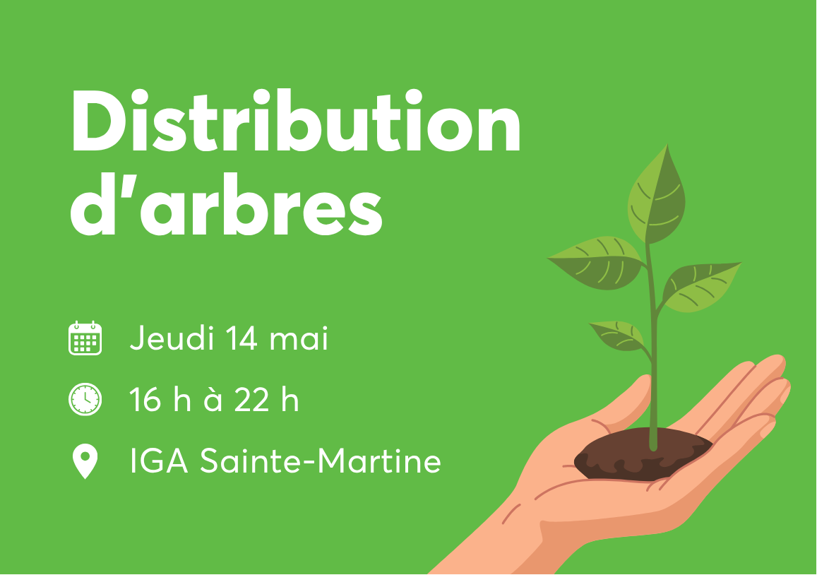 Encore cette année, la Municipalité offrira des arbres gratuitement grâce au soutien du ministère des Ressources naturelles et des Forêts et des Clubs 4-H du Québec. La distribution sera effectuée par la Maison des jeunes L’Entracte.