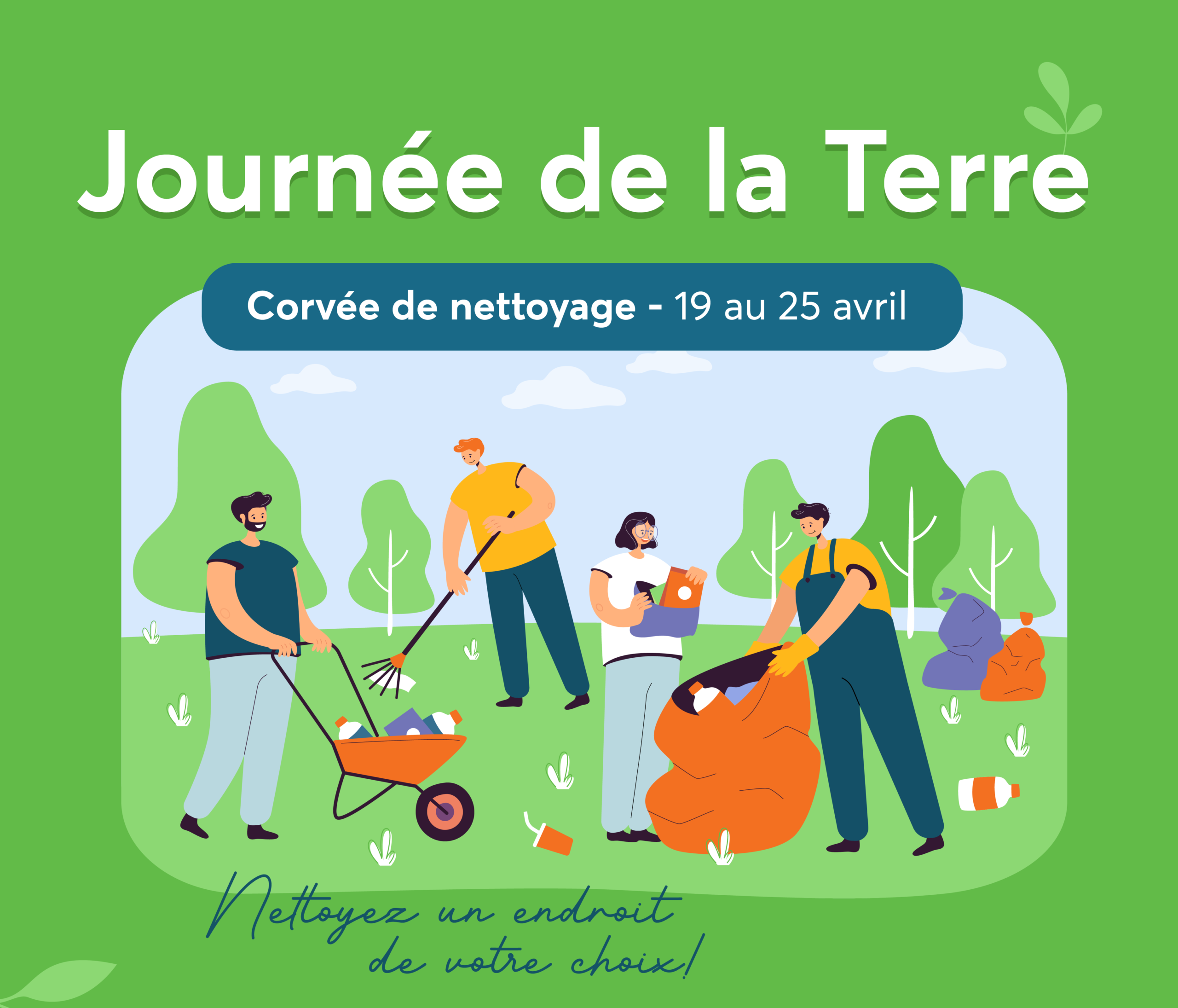 Le Jour de la Terre étant le 22 avril, joignez-vous à l’effort collectif durant la semaine du 19 au 25 avril. Nettoyer une section de votre rue, votre parc préféré ou un endroit de votre choix, au moment qui vous convient durant cette semaine.